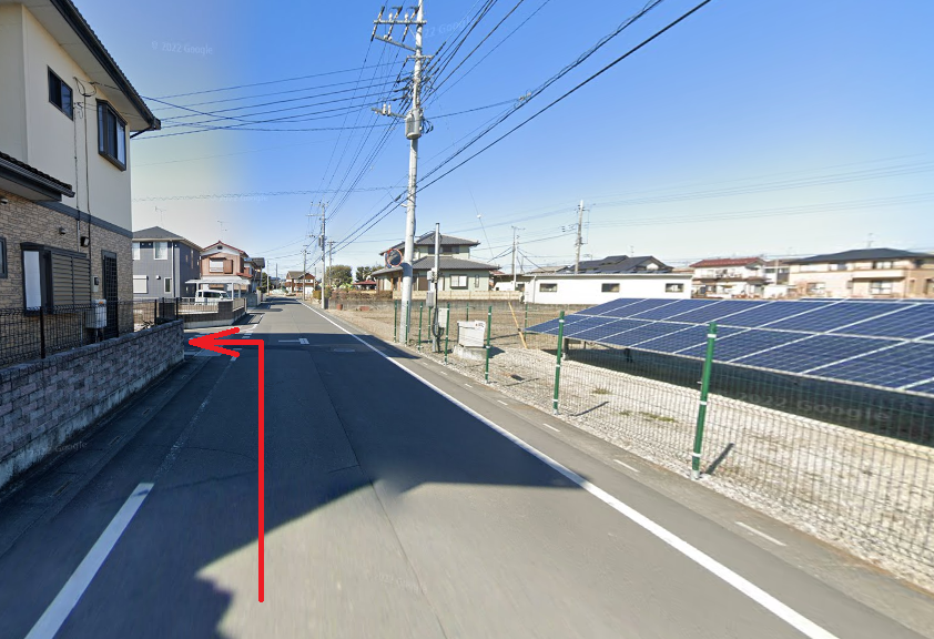 細い道がいくつもあります。太陽光パネルを過ぎた先のT字路を南へ入ります。
