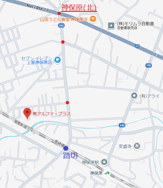 お車では 国道17号線 神保原(北) の交差点を南下、二つ目の信号(押しボタン式)を西へ入ります。